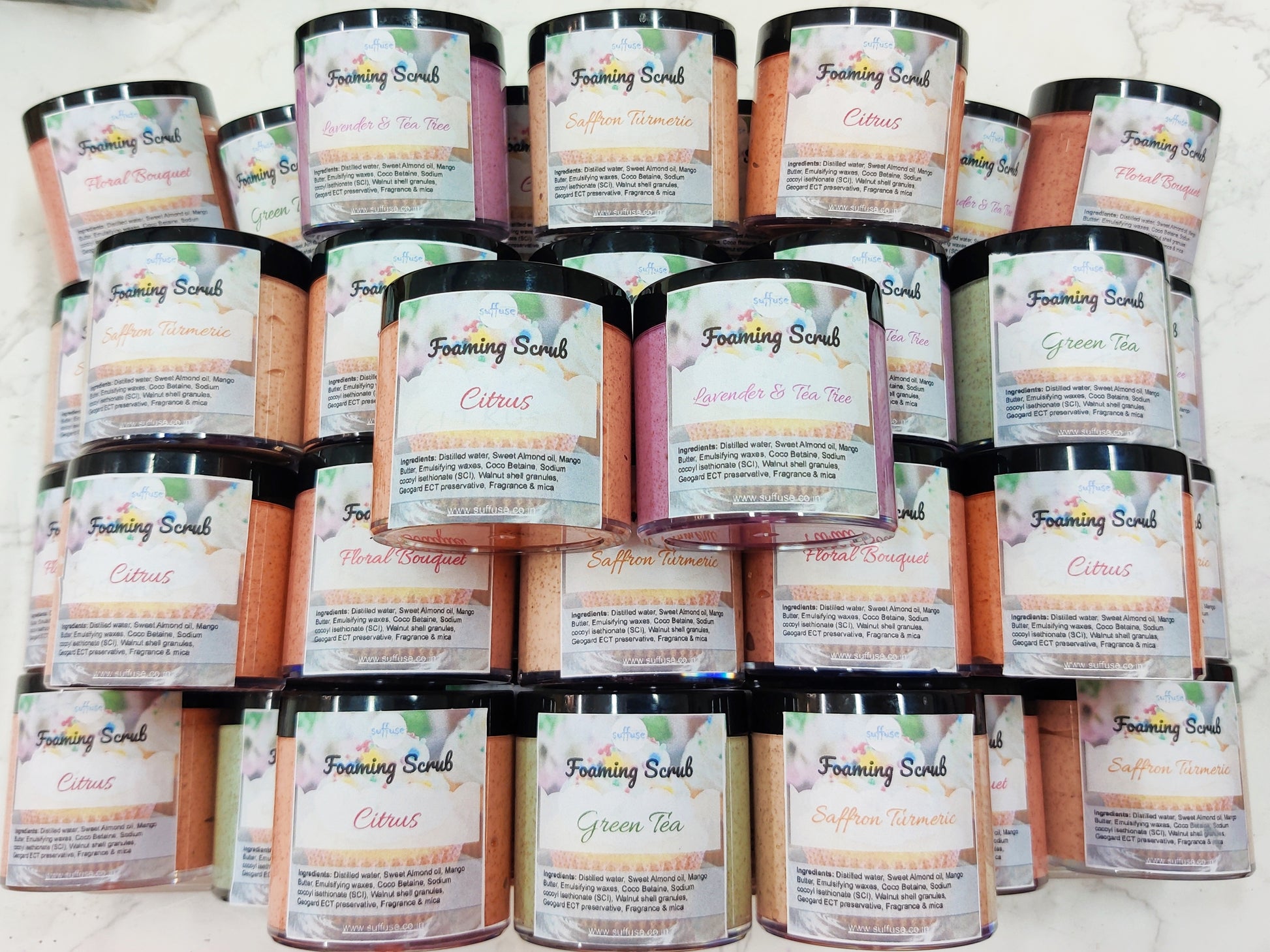 Ingredients: Distilled water, Sweet Almond oil, Mango Butter, Emulsifying waxes, Coco Betaine, Sodium cocoyl isethionate (SCI), Walnut shell granules, Geogard ECT preservative, Fragrance & mica