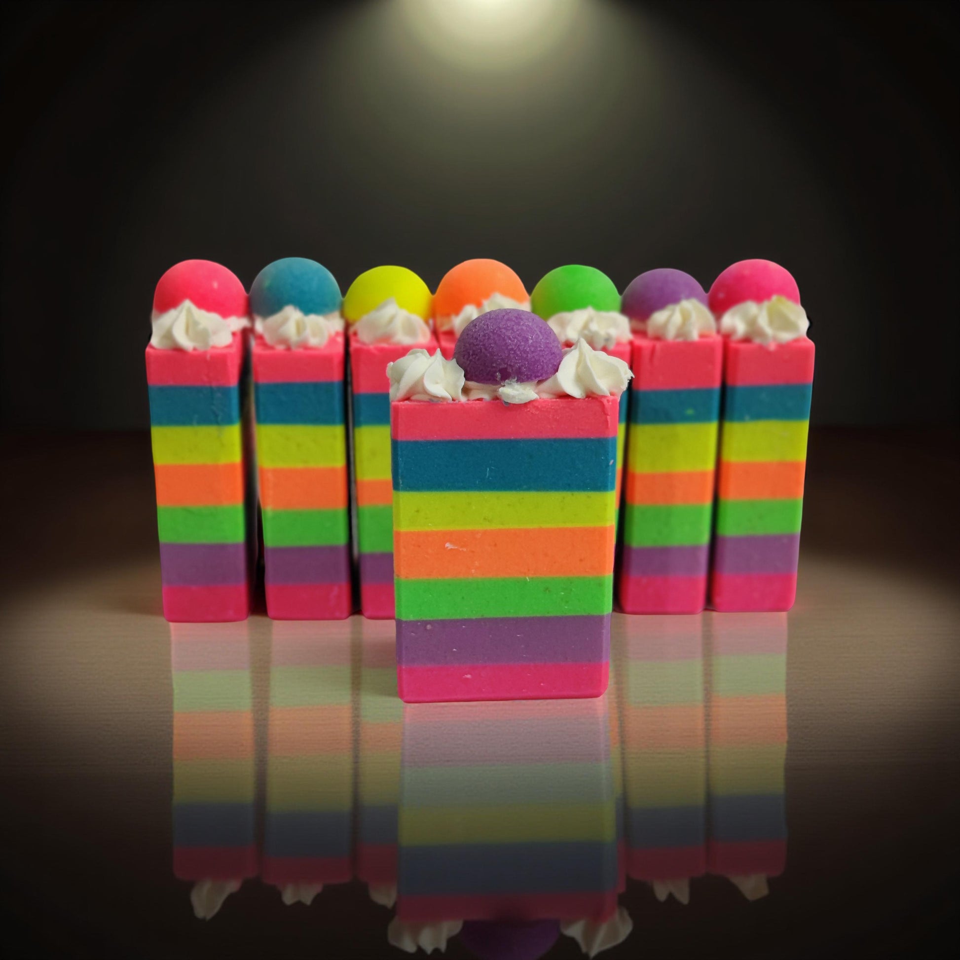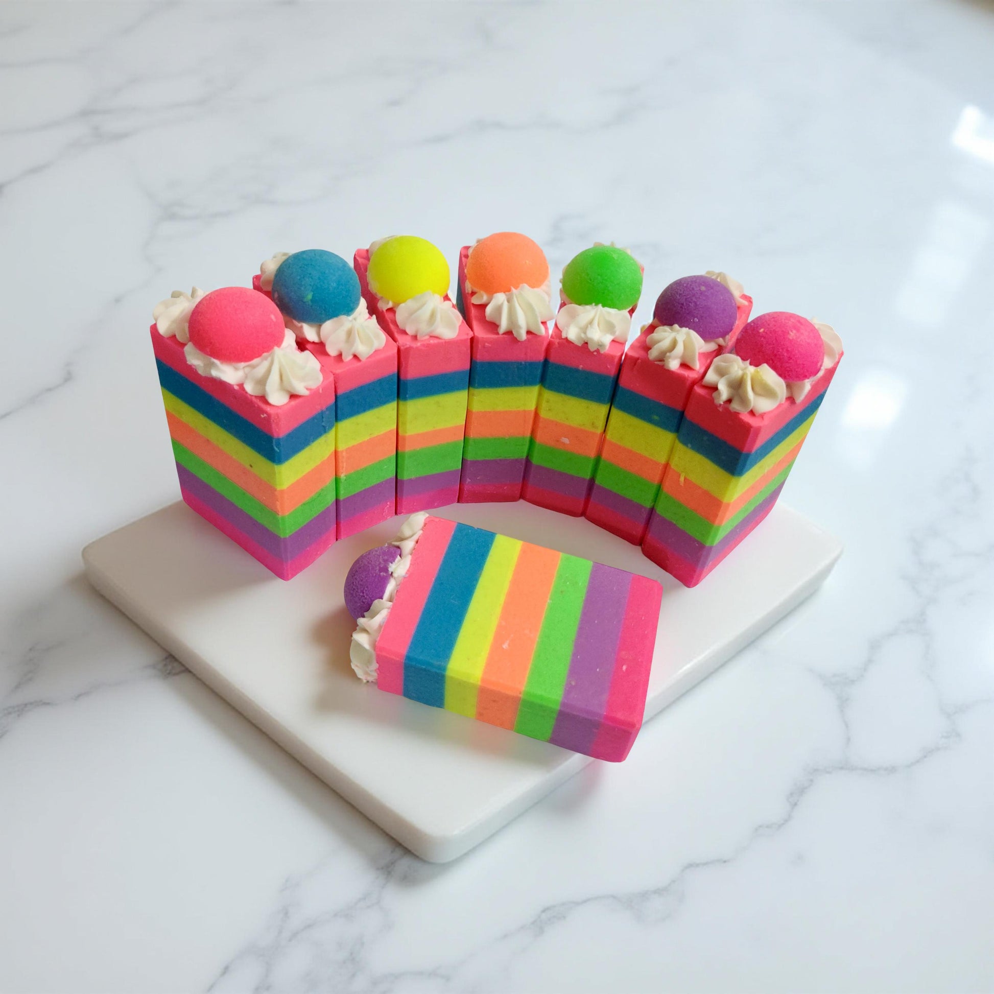 A dessert for your skin minus the calories! This handcrafted cold process soap is made with real homemade yogurt and designed in playful layers inspired by the vibrant colors of frozen yogurt, topped with a fluffy white frosting and a cute glycerin soap embed.
