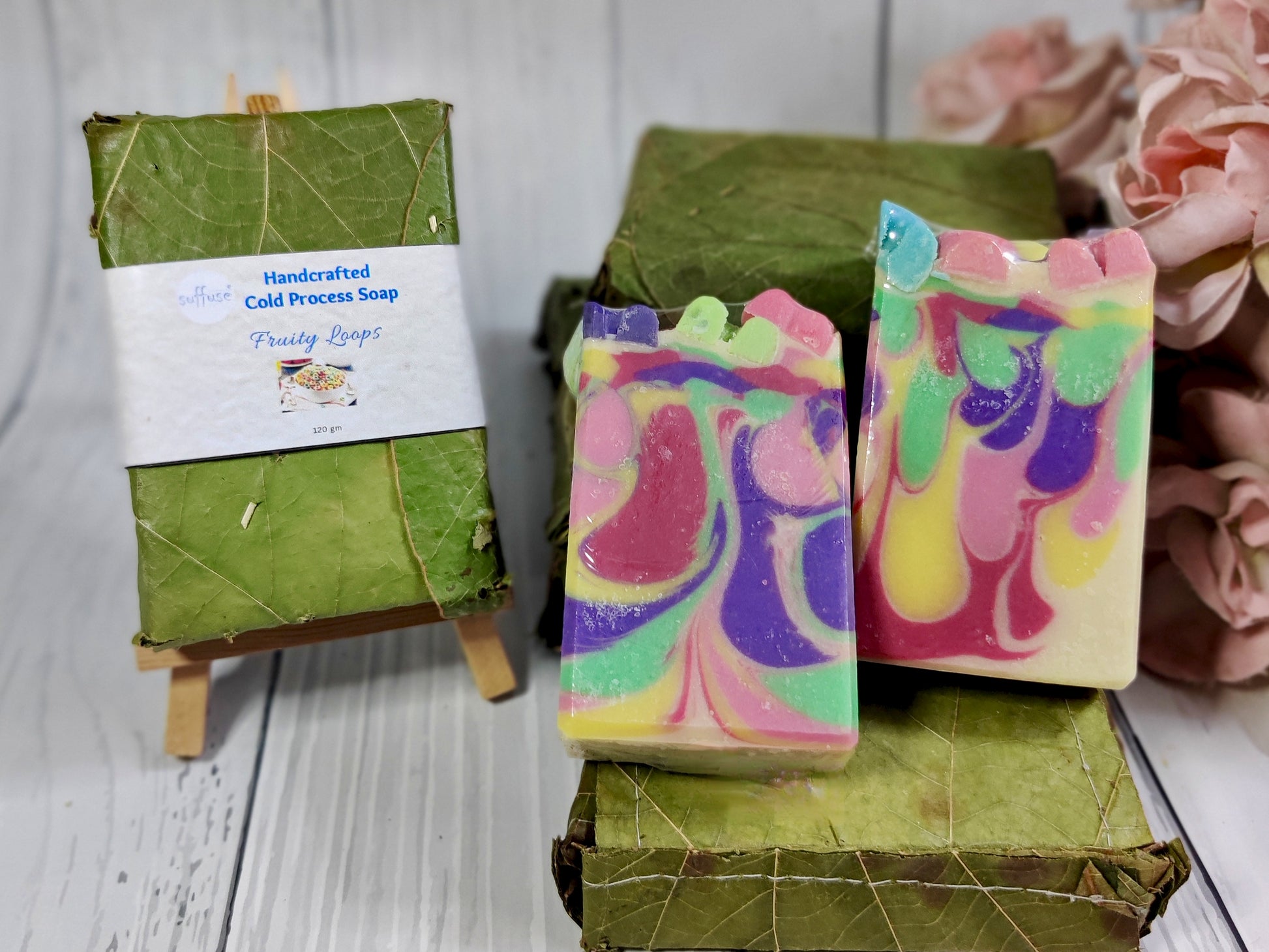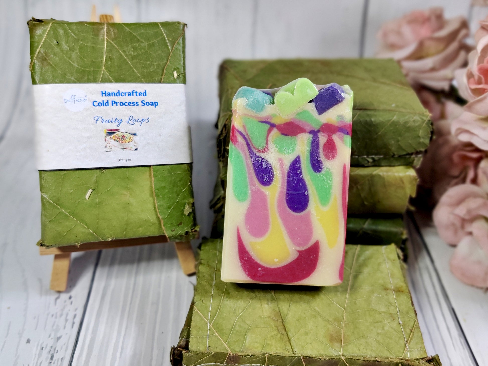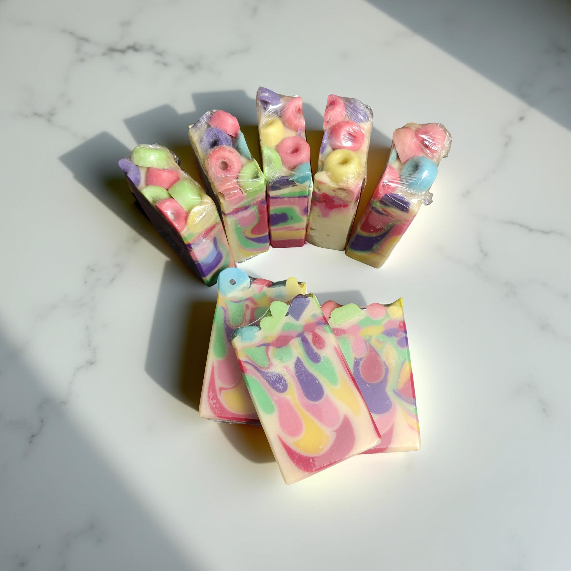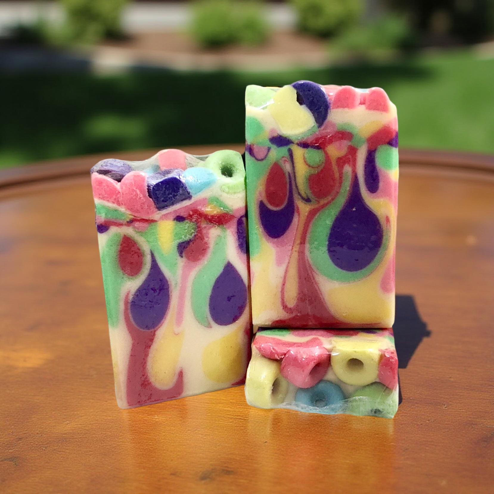 Handcrafted Cold Process soap enriched with nourishing shea butter and scented with the irresistible Black Raspberry Vanilla fragrance. This playful bar features vibrant loops of color and fun fruit loop-inspired embeds that make every wash a joyful experience.