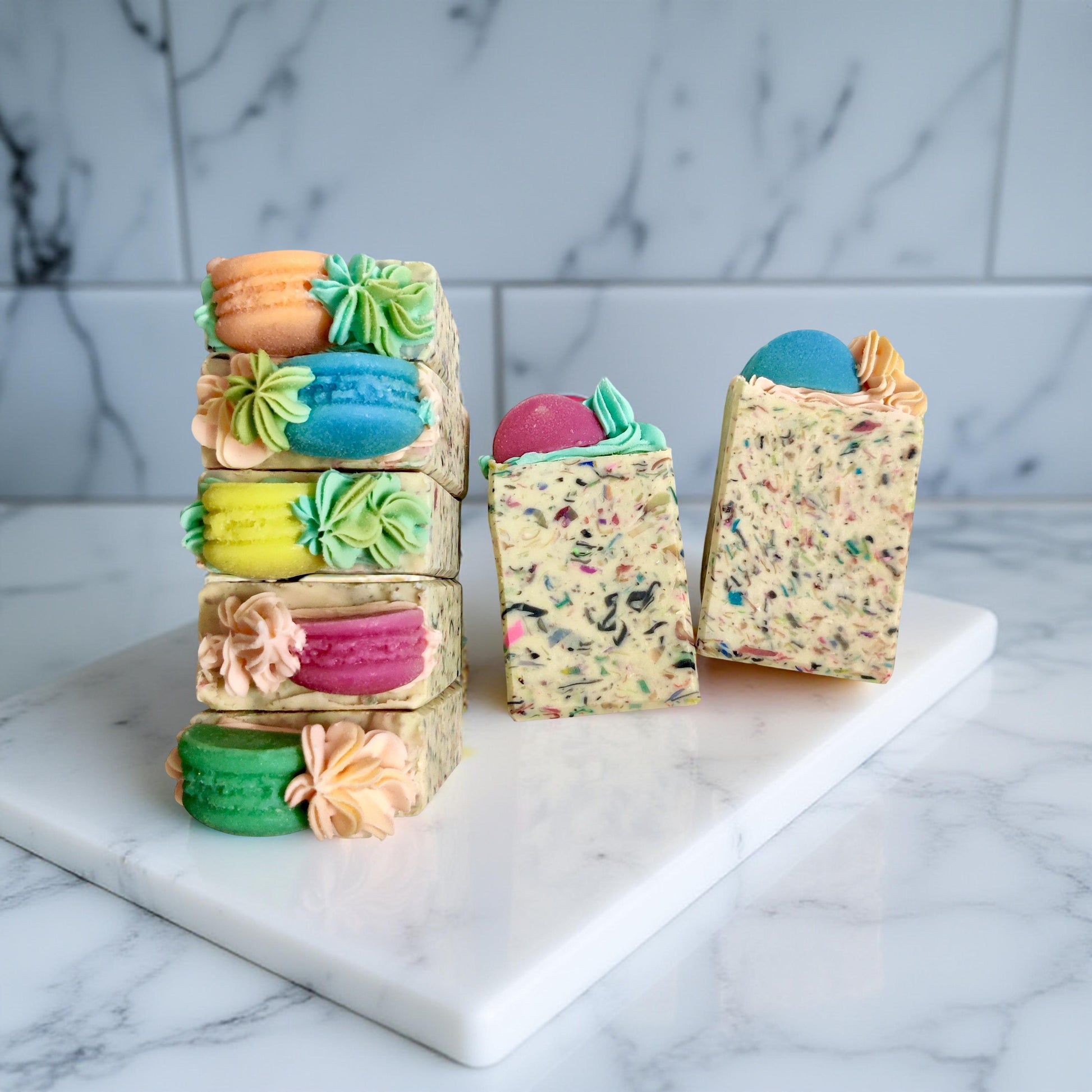 A treat for your senses and your skin! This handcrafted cold process soap is enriched with nourishing oils and luxurious shea butter for a rich, creamy lather. Topped with colorful, sulphate-free melt and pour macaron embeds, it's as delightful to look at as it is to use!