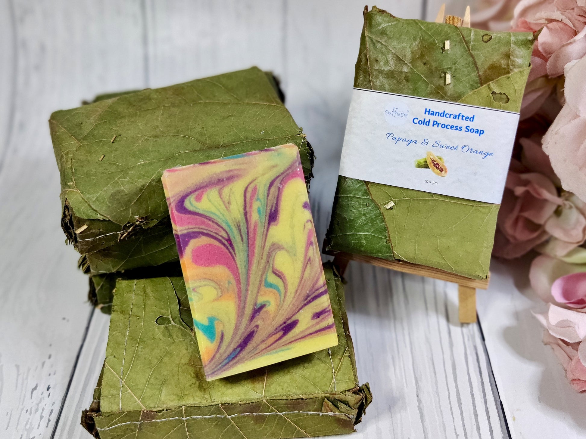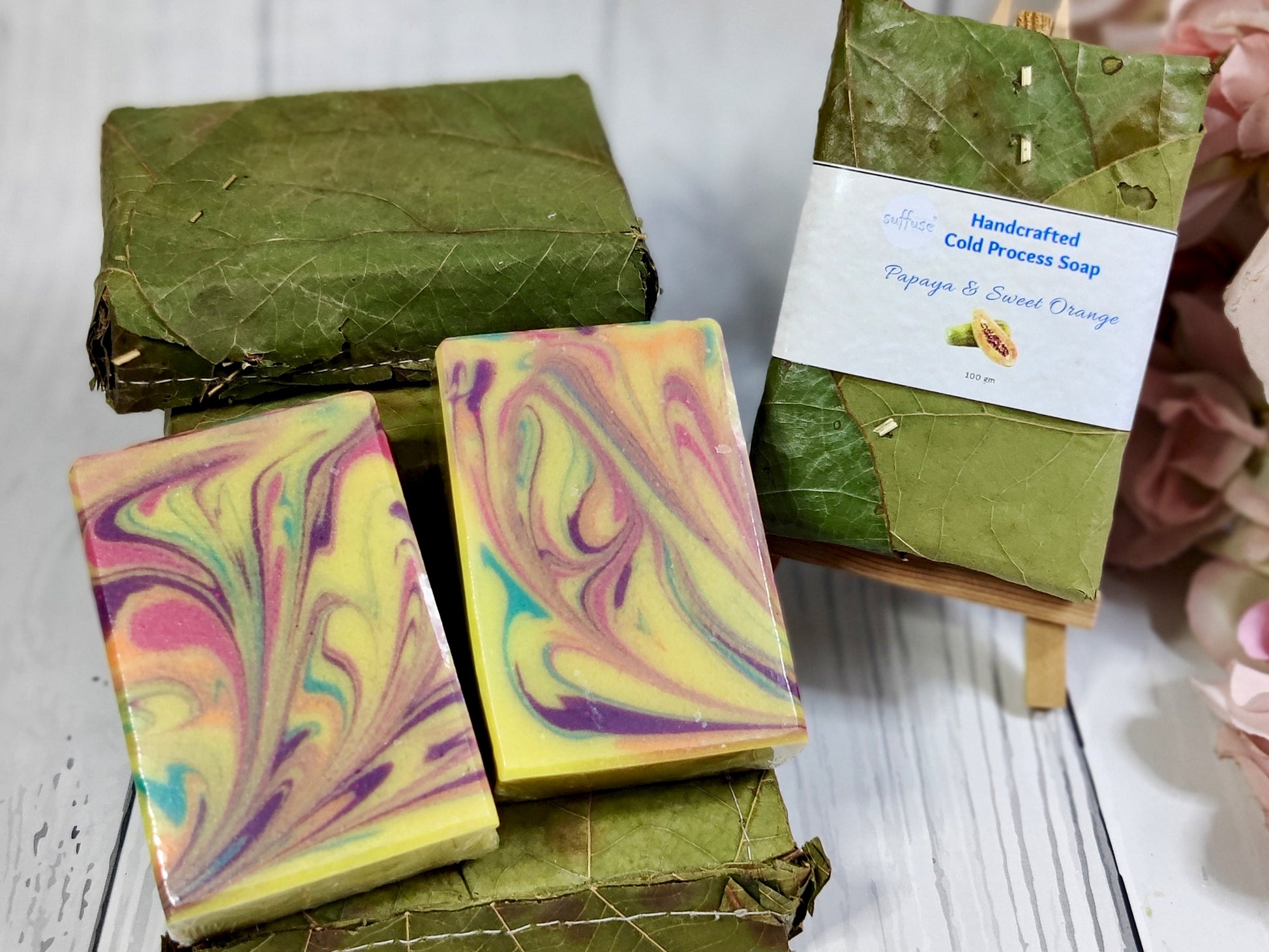 Indulge in our handcrafted, cold process soap, infused with the sweet, juicy goodness of fresh papaya juice and the uplifting essence of sweet orange essential oil.