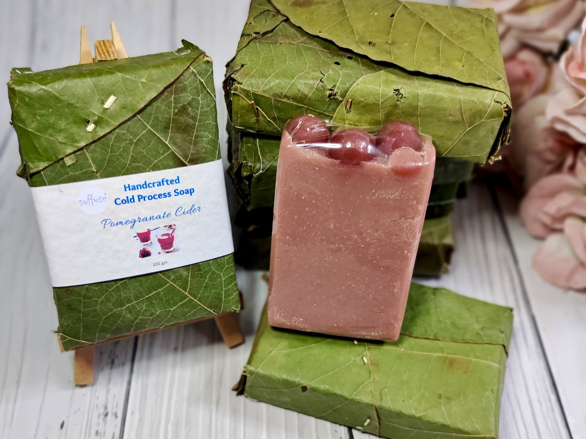Handcrafted Cold Process soap made with skin-loving oils and enriched with antioxidant-rich pomegranate cider wine.