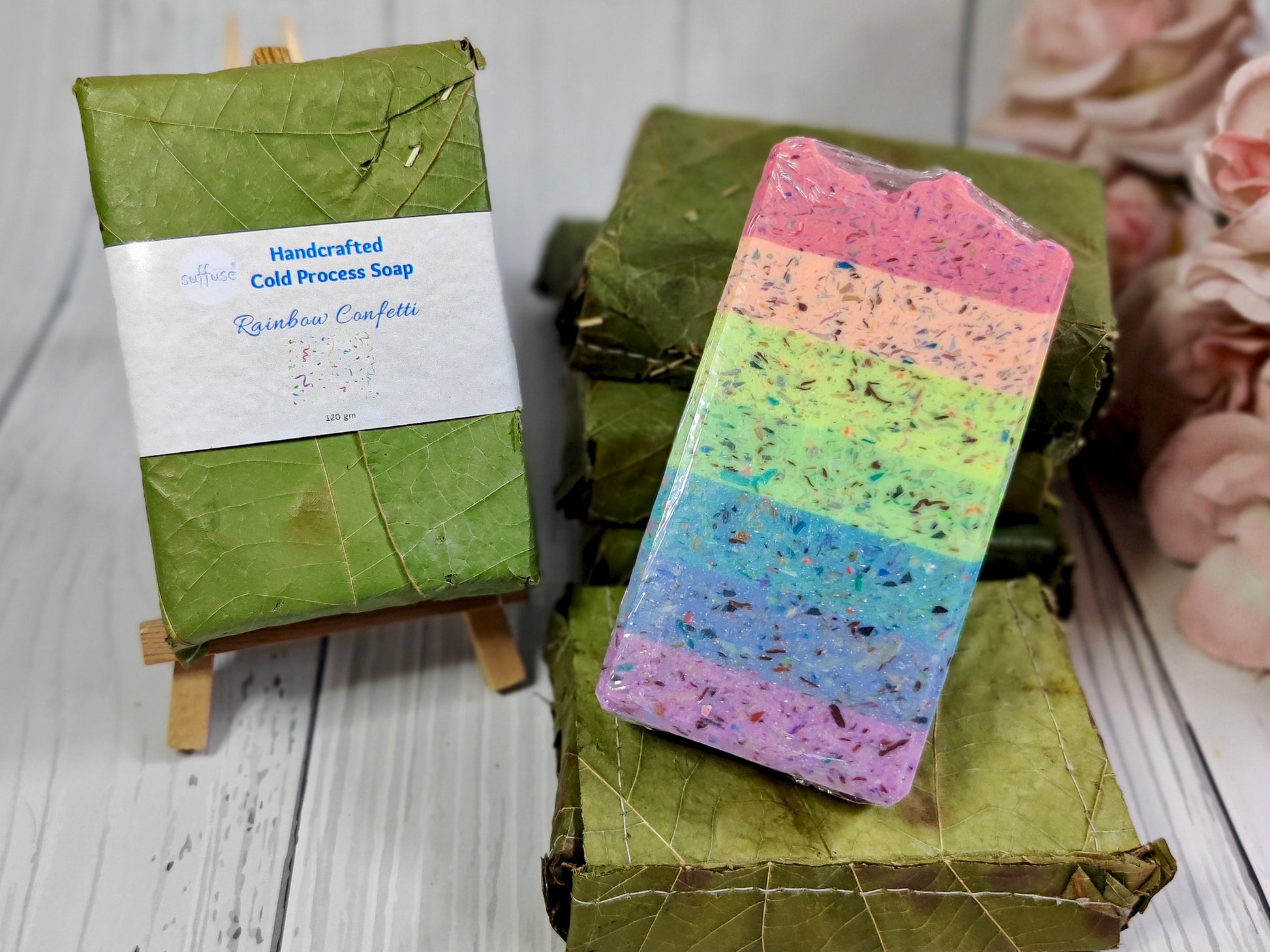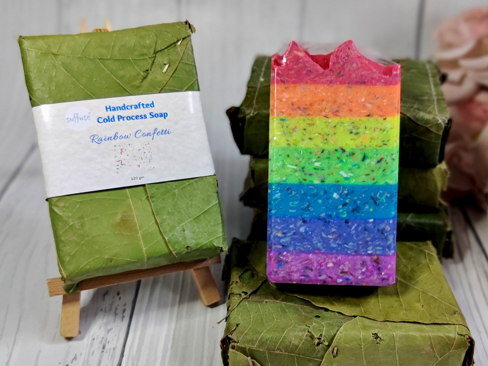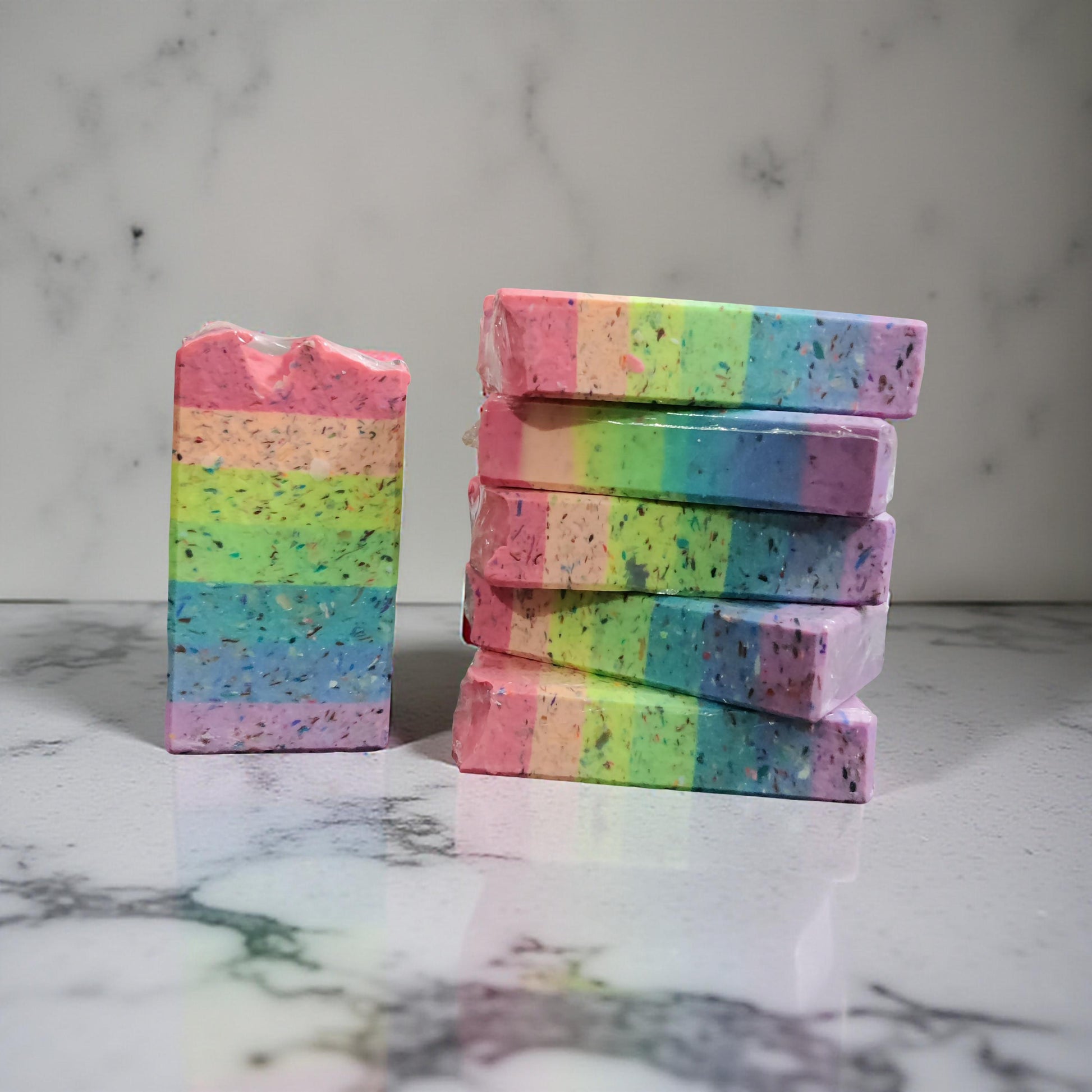 Handcrafted cold process soap made with nourishing skin-loving oils and rich cocoa butter, beautifully layered in vibrant rainbow colors. This cheerful bar delivers a moisturizing and gentle cleanse that brightens your skin and your day.